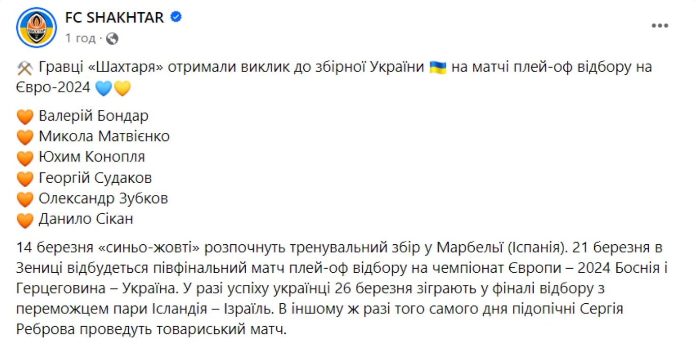Опублікований Міністерством молоді та спорту список гравців, які поїдуть грати за збірну України проти Боснії і Герцеговини в плей-оф кваліфікації на Євро-2024, виявився неактуальним. Це підтвердив донецький "Шахтар".